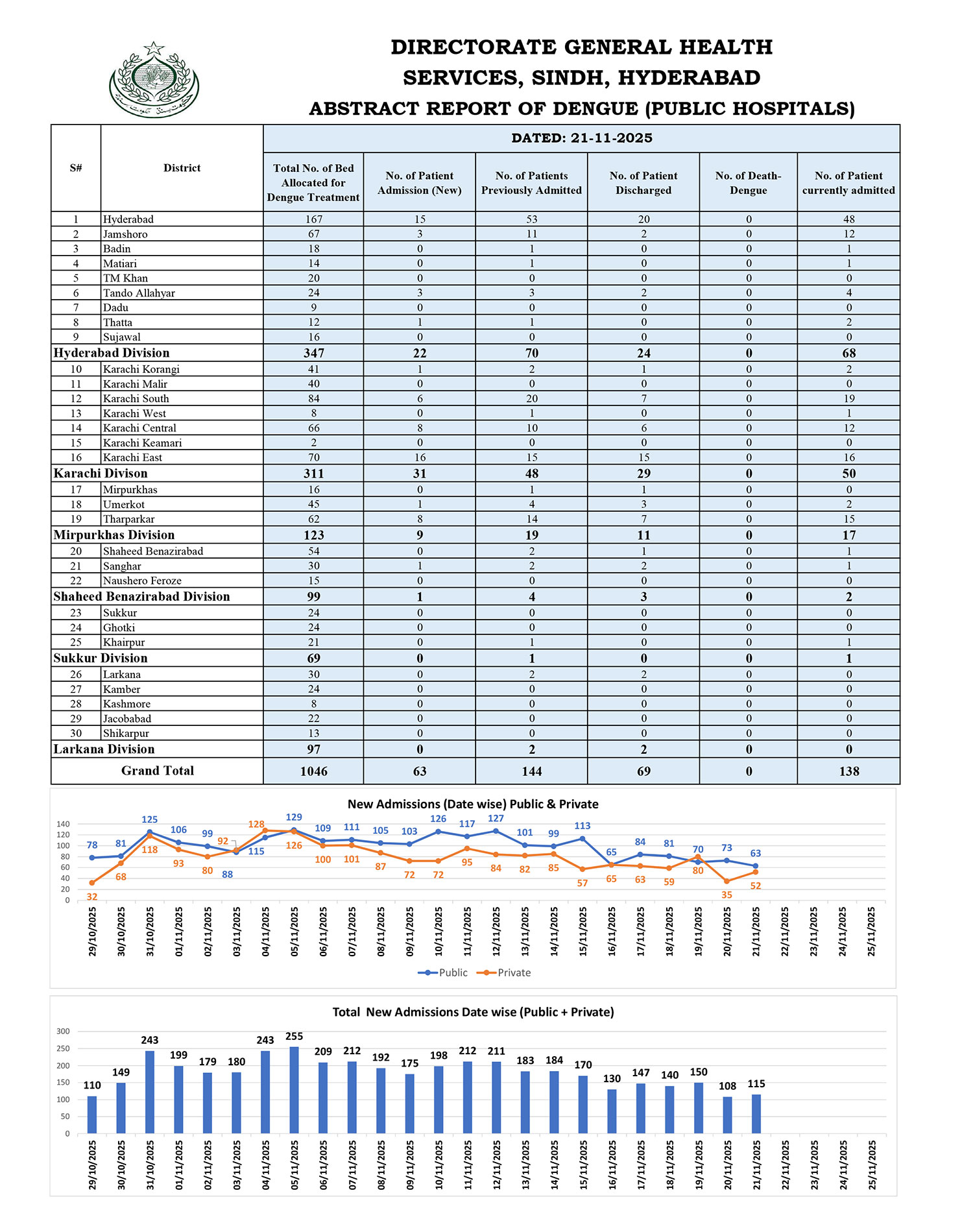 The Karachi Division recorded the highest number of new cases in public hospitals, with 31 fresh admissions, followed by Hyderabad where 15 patients were admitted to government hospitals. Seventeen additional dengue cases were reported from other districts of Sindh. Meanwhile, 69 patients were discharged after recovery from public hospitals, while private healthcare facilities reported 79 recoveries during the same period. No dengue-related death was reported anywhere in the province.