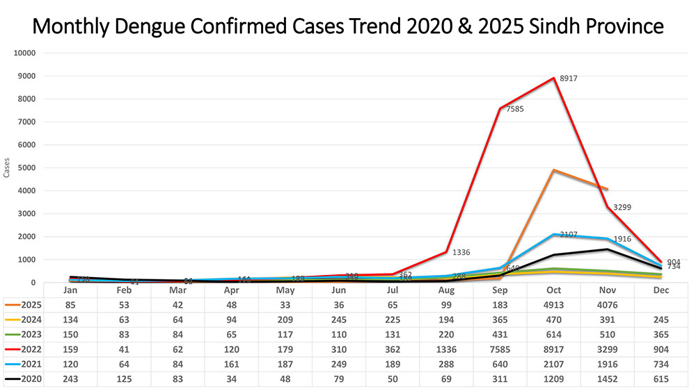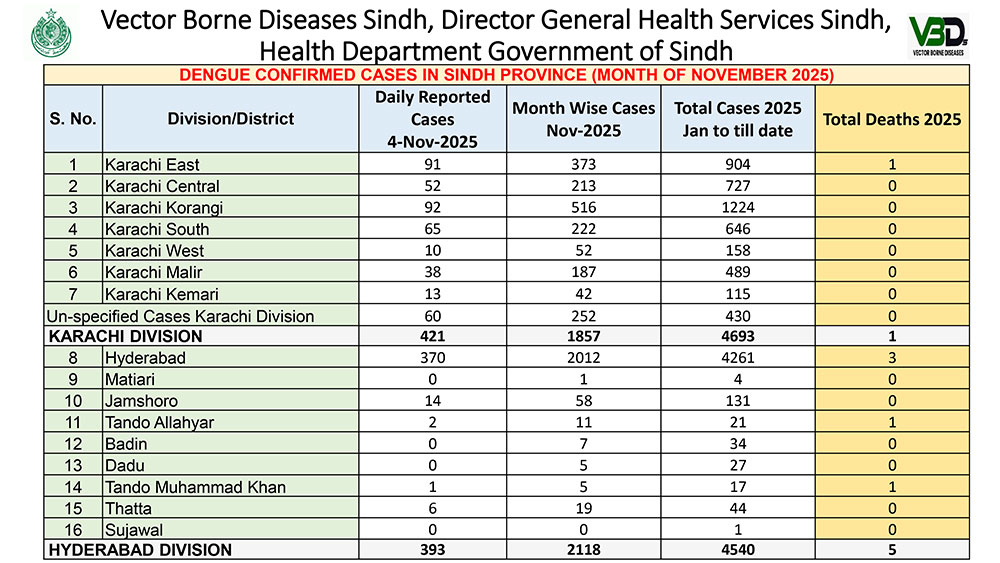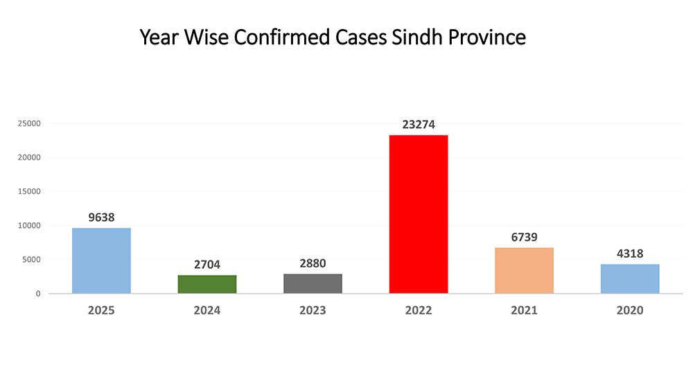 Hyderabad remains the most affected district overall, with 4,261 confirmed cases and five deaths reported in 2025. Other districts with noticeable case numbers include Jamshoro (131), Thatta (47), and Badin (31).