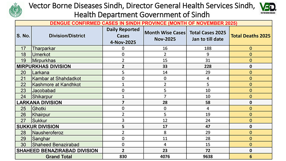 KARACHI: The Sindh Health Department has confirmed that a total of 9,638 dengue cases have been reported across the province so far this year, with six deaths recorded. The latest figures from the Directorate of Vector Borne Diseases show that the Hyderabad Division remains the epicenter of the outbreak, reporting 4,540 cases — nearly half of Sindh’s total.