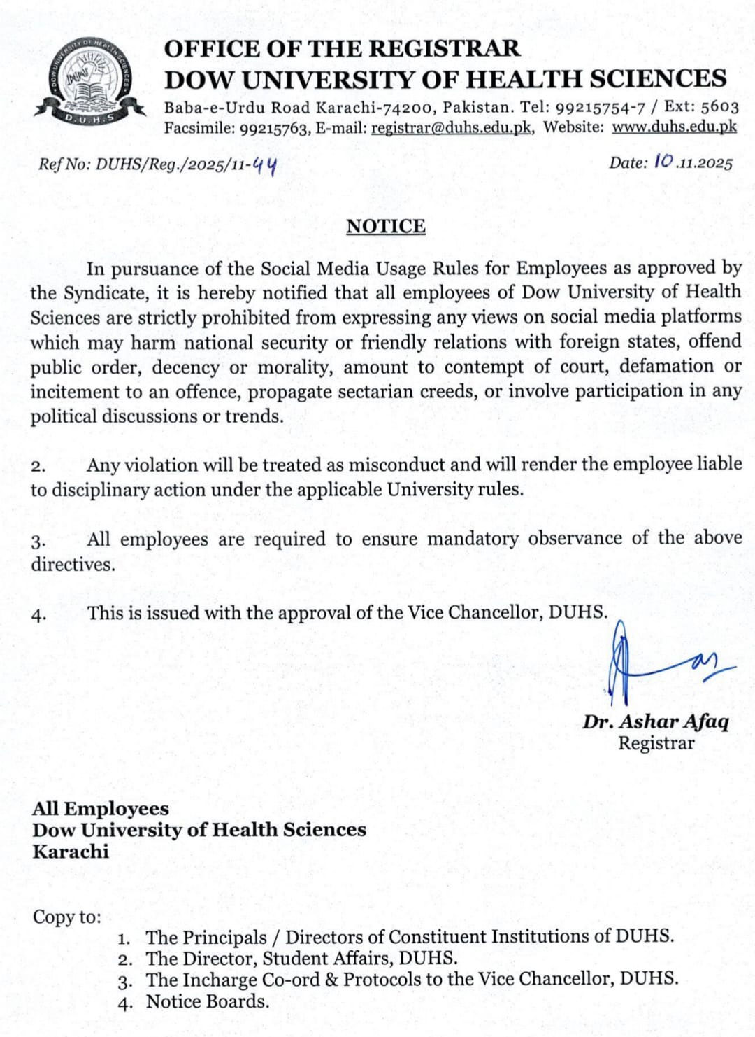 According to the official notice (Ref No. DUHS/Reg./2025/11-44), signed by Registrar Dr. Ashar Afaq and approved by the Vice Chancellor, all DUHS employees are barred from making social media statements or participating in any political discussions, trends, or commentary that may “offend public order, morality, amount to contempt of court, defamation, or harm national security or relations with foreign states.”