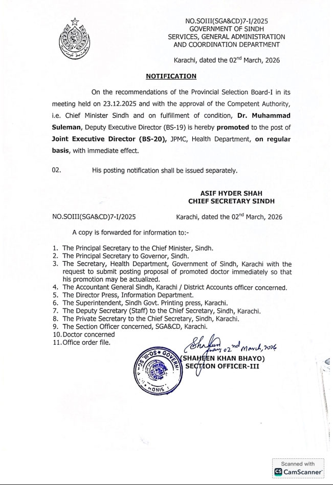 KARACHI: The Government of Sindh has promoted Dr. Muhammad Suleman to the post of Joint Executive Director (BS-20) at Jinnah Postgraduate Medical Centre (JPMC), Karachi, with immediate effect.