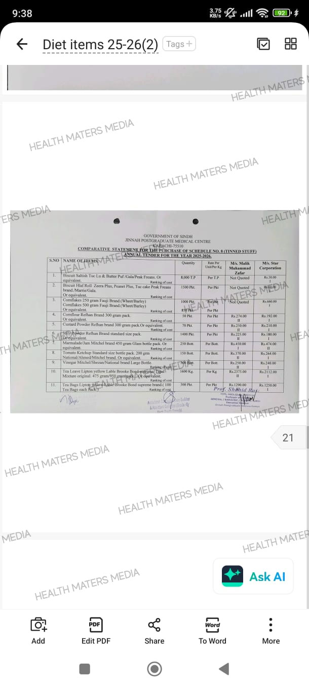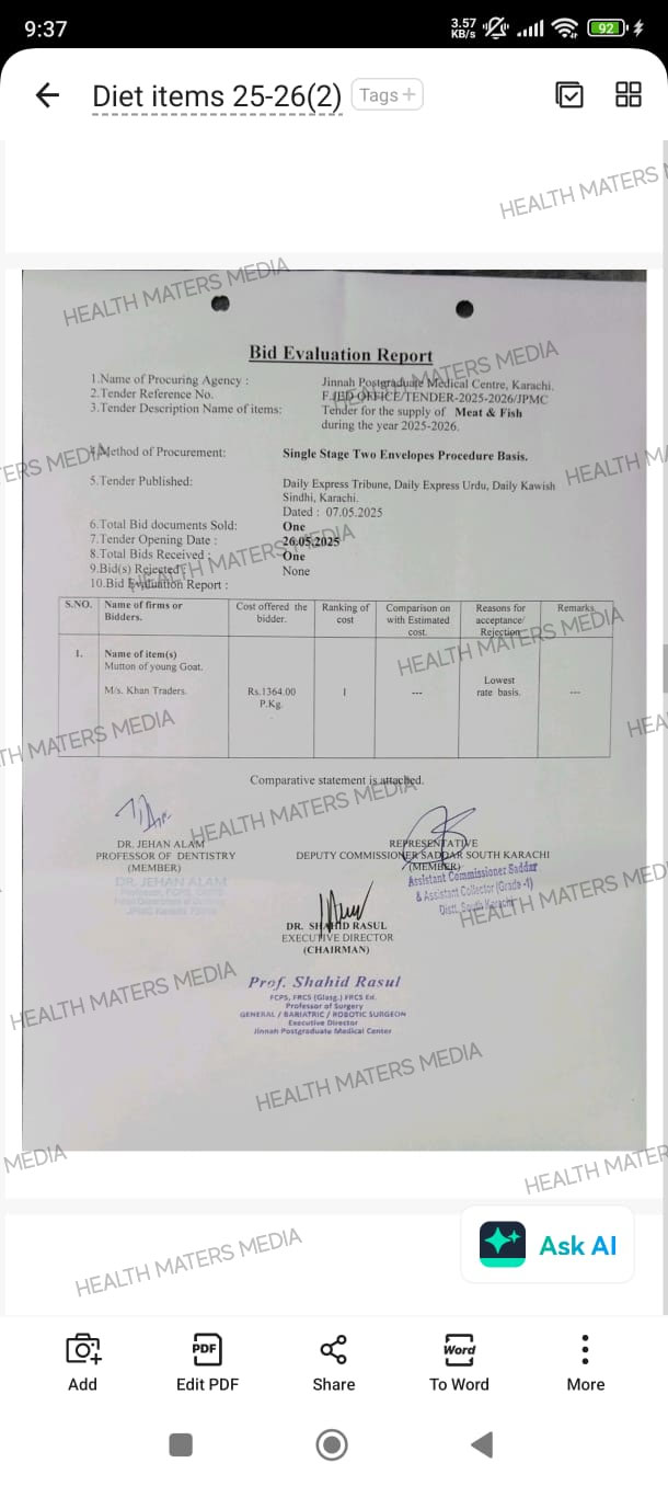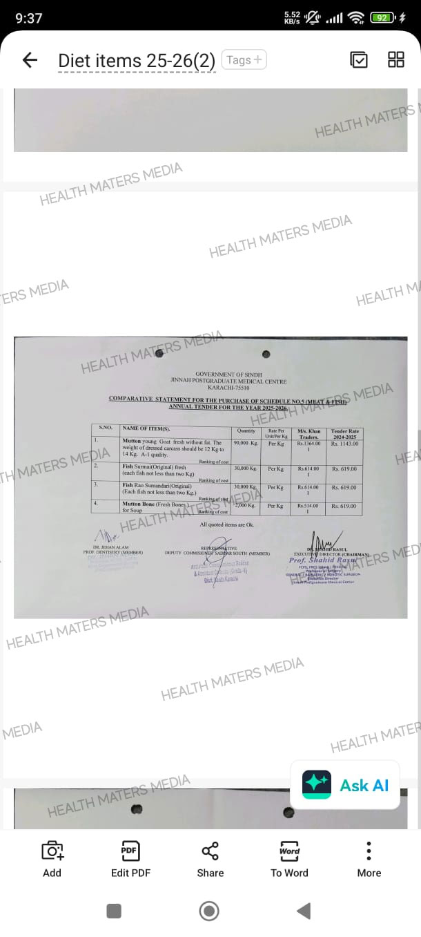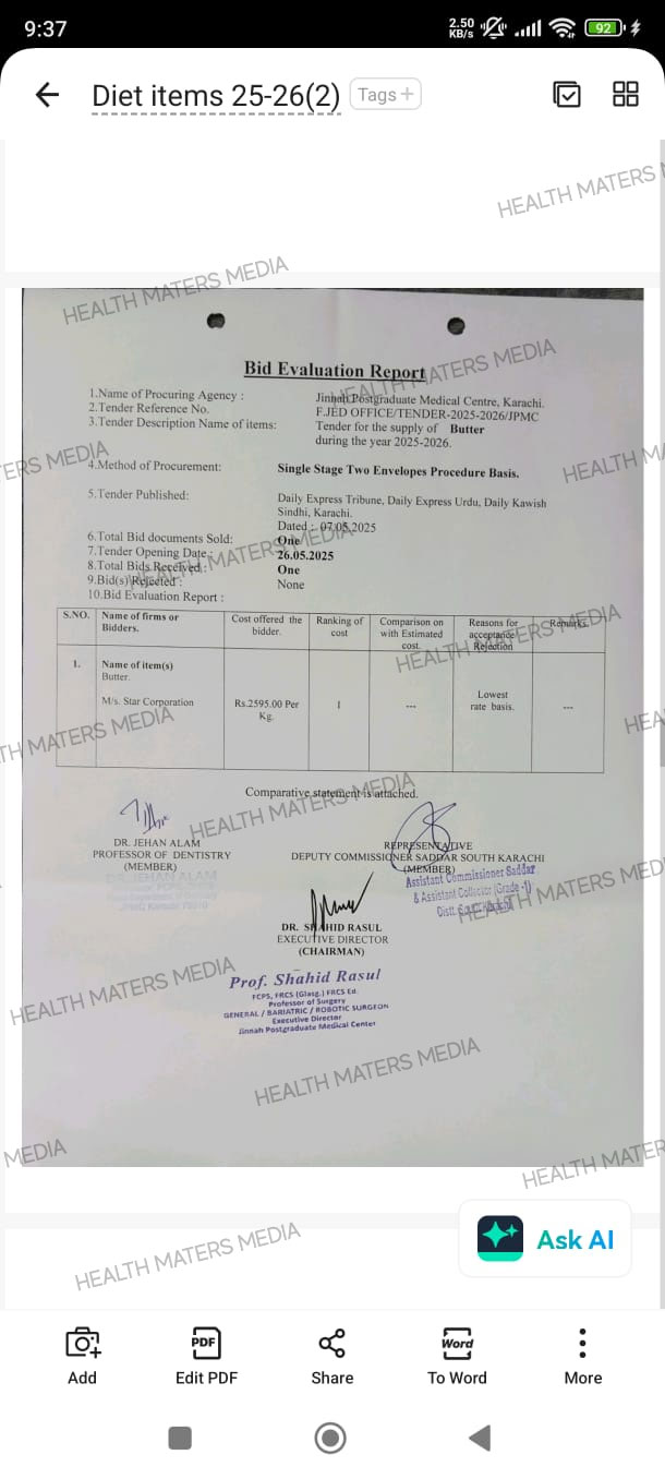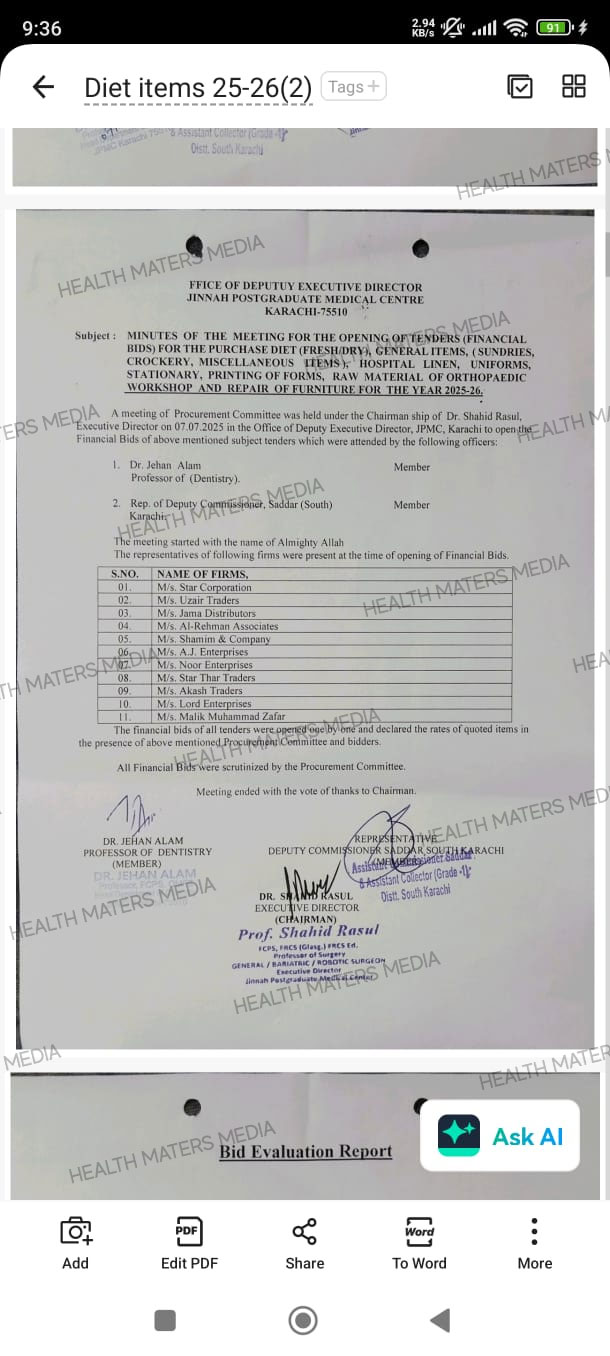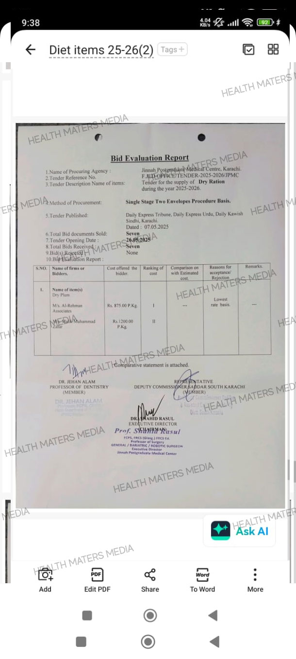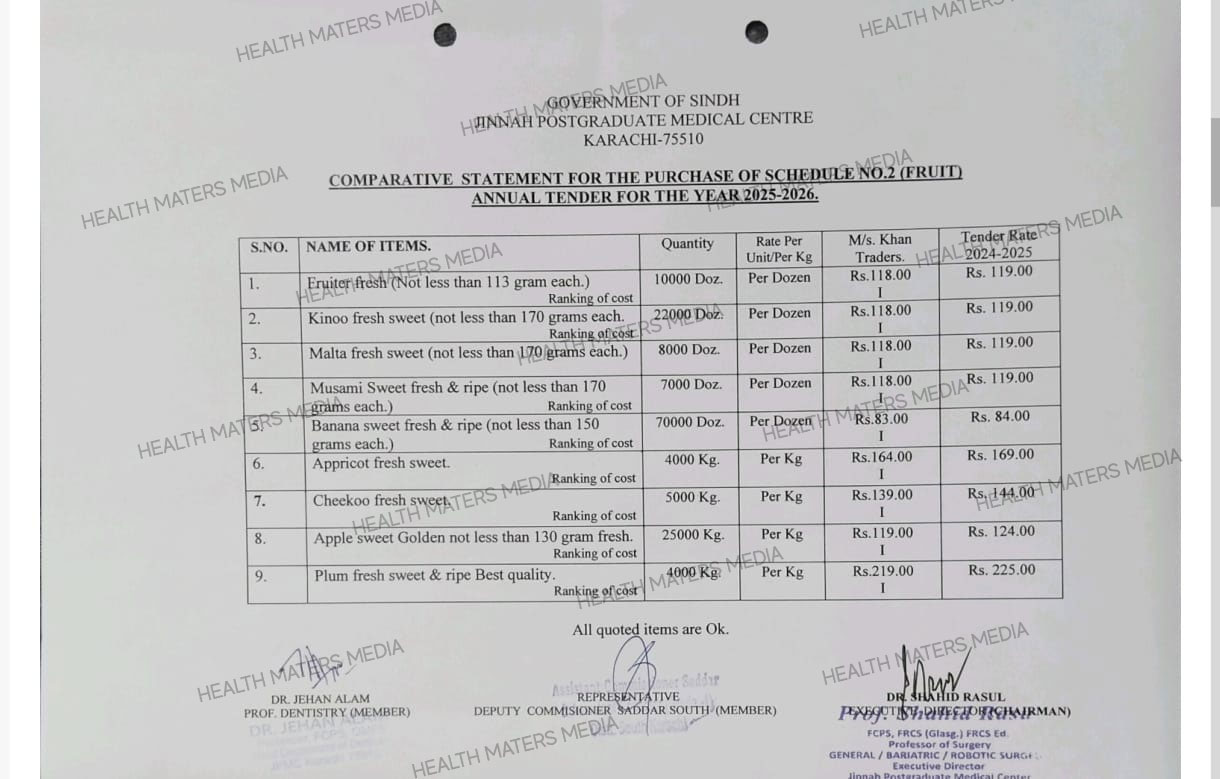 KARACHI: A major procurement scandal has emerged at Jinnah Postgraduate Medical Centre (JPMC), Karachi, where Khan Traders — absent from the official tender session — was still awarded contracts worth billions of rupees for patients’ diet supplies. The awards were granted on single bids, in direct violation of Sindh Public Procurement Authority (SPPRA) rules and amid allegations of favoritism.