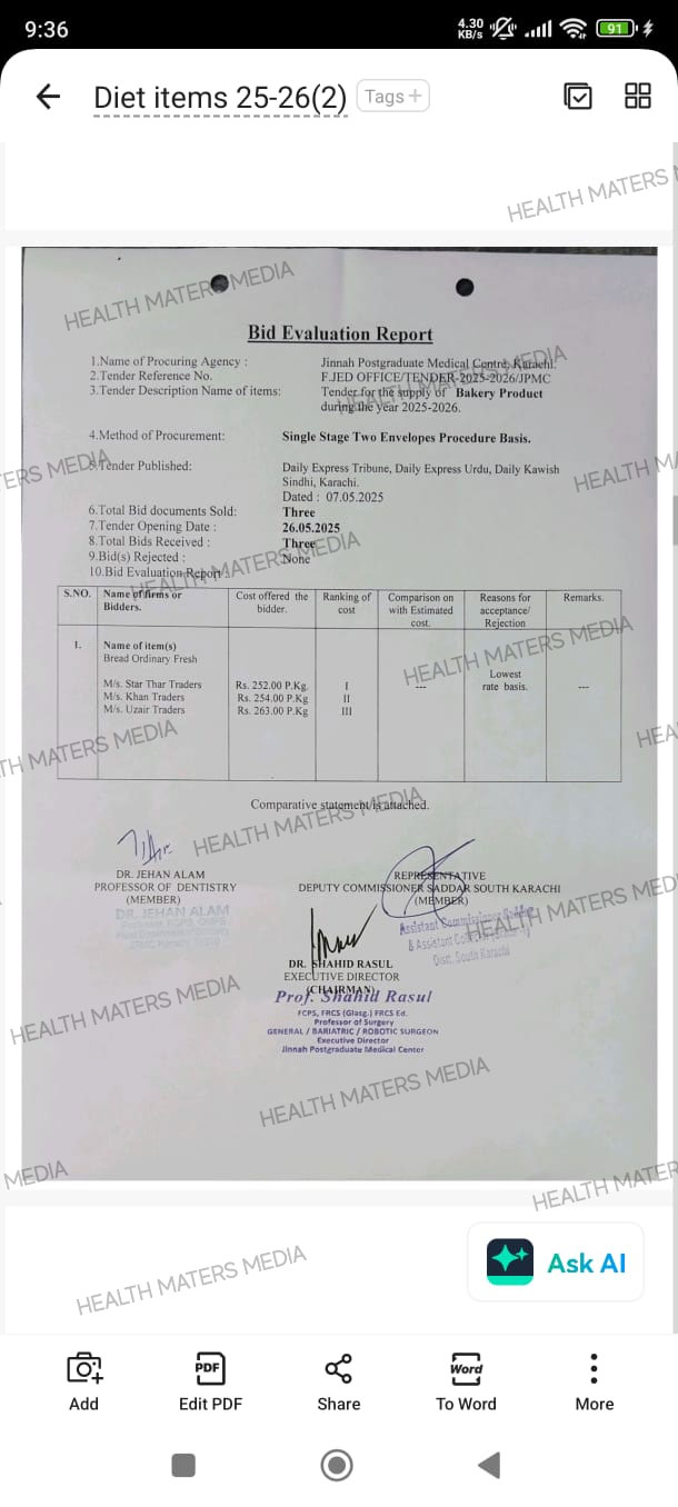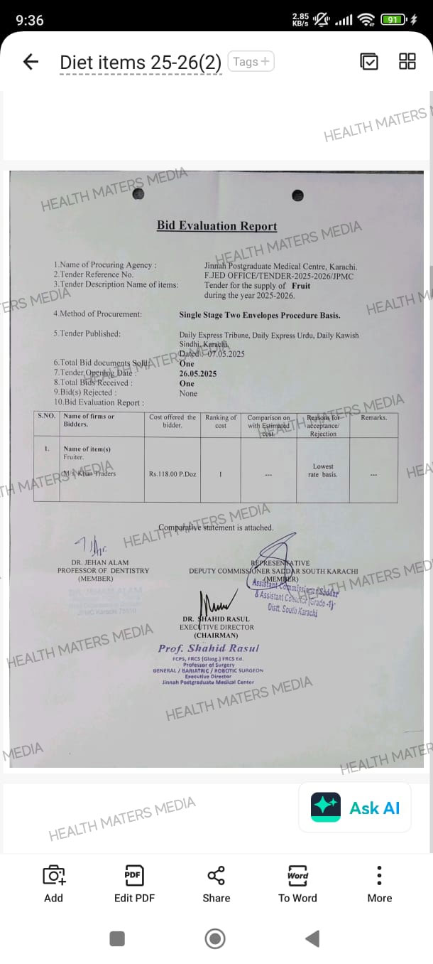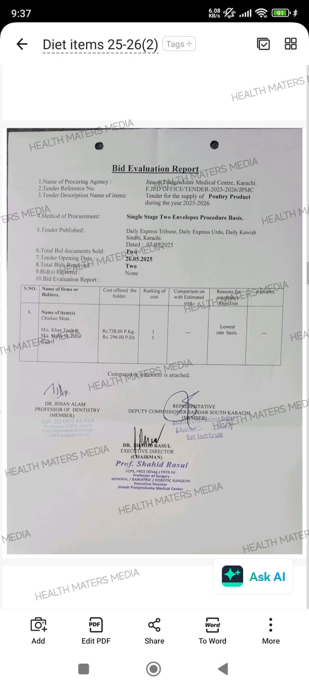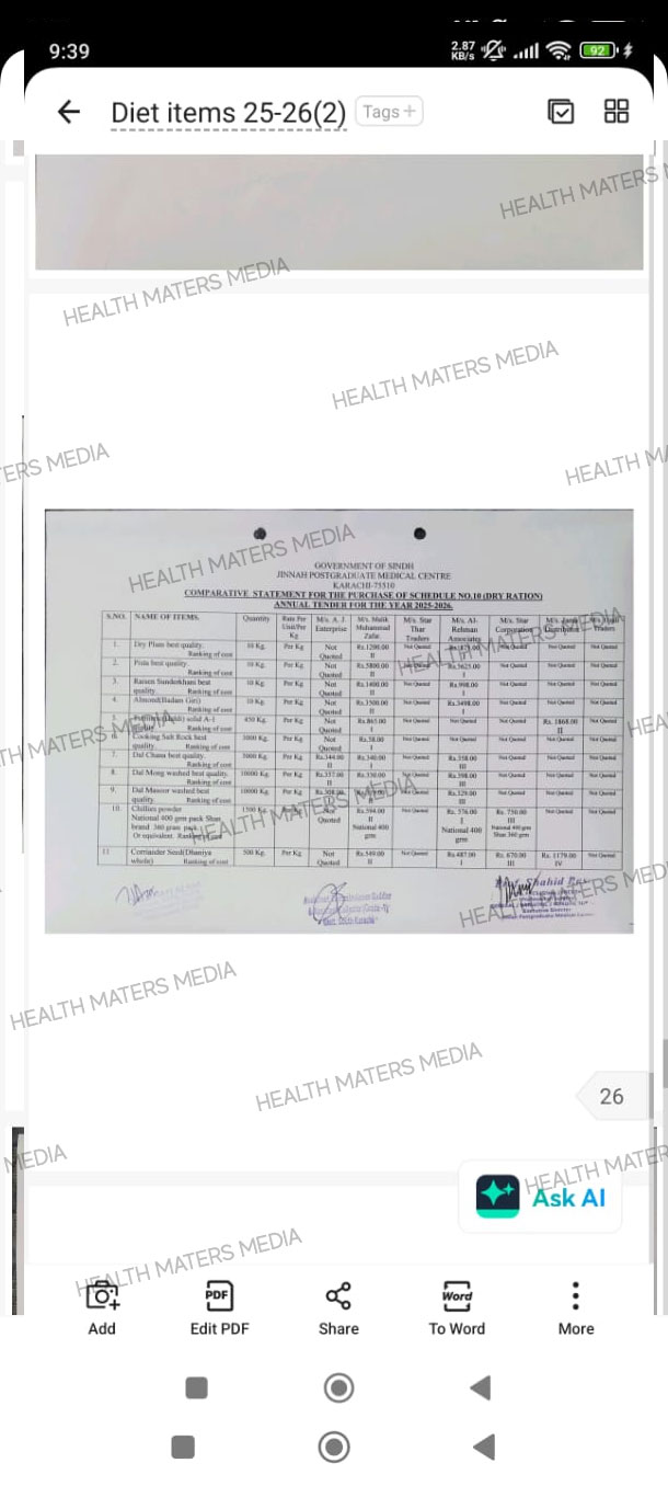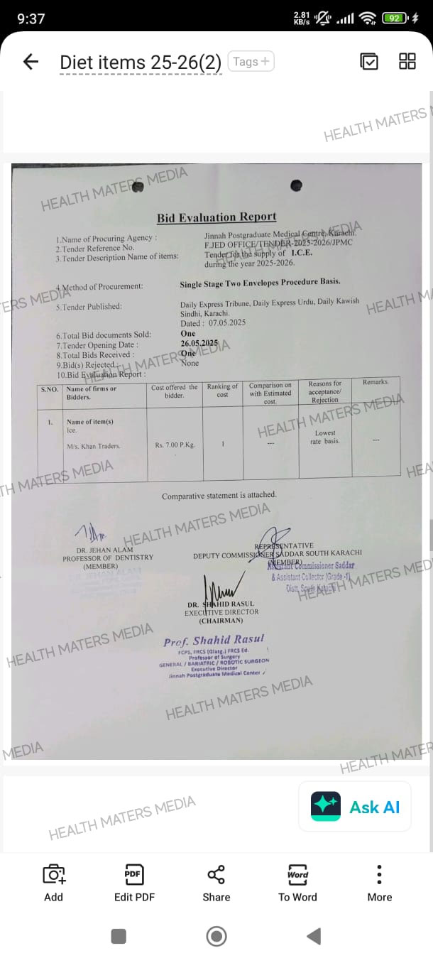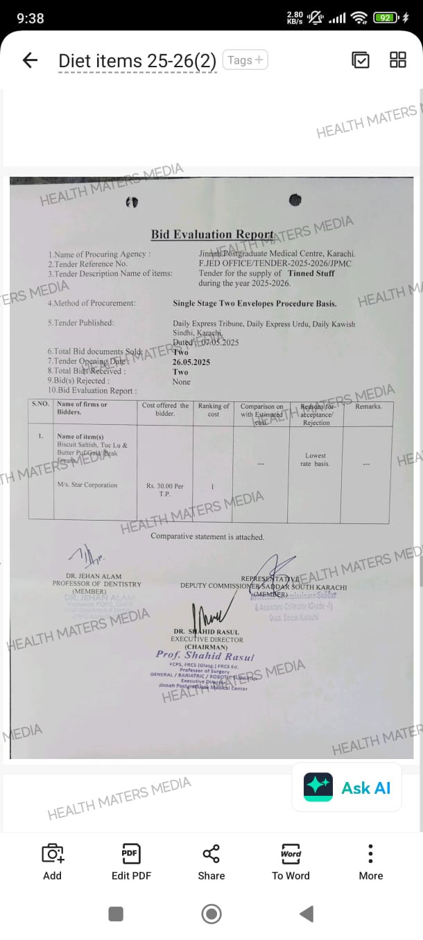 KARACHI: A major procurement scandal has emerged at Jinnah Postgraduate Medical Centre (JPMC), Karachi, where Khan Traders — absent from the official tender session — was still awarded contracts worth billions of rupees for patients’ diet supplies. The awards were granted on single bids, in direct violation of Sindh Public Procurement Authority (SPPRA) rules and amid allegations of favoritism.