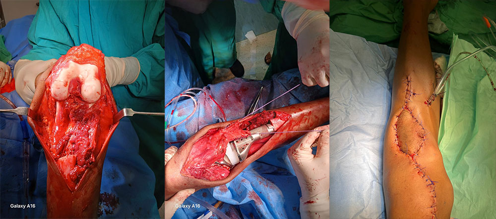 The complex procedure involved a wide margin excision, followed by reconstruction using a megaprosthesis and flap, ensuring both cancer clearance and limb preservation.