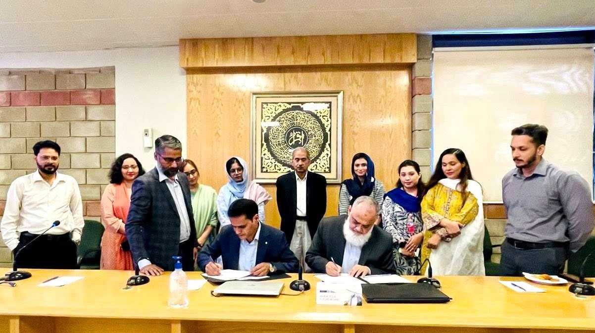The MoU was signed by Mr. Aseem Majid Rizvi, Registrar of Iqra University, and Mr. Raheel Ahmed, Chief Executive Officer of HWSK.