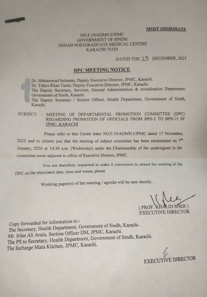 Official documents show that JPMC has convened a Departmental Promotion Committee (DPC) meeting on January 7, 2026, to consider promotions of officials from BPS-2 to BPS-15. The meeting is to be chaired by the Executive Director JPMC and includes senior hospital officers along with representatives from the Services and Health Departments of the Government of Sindh.