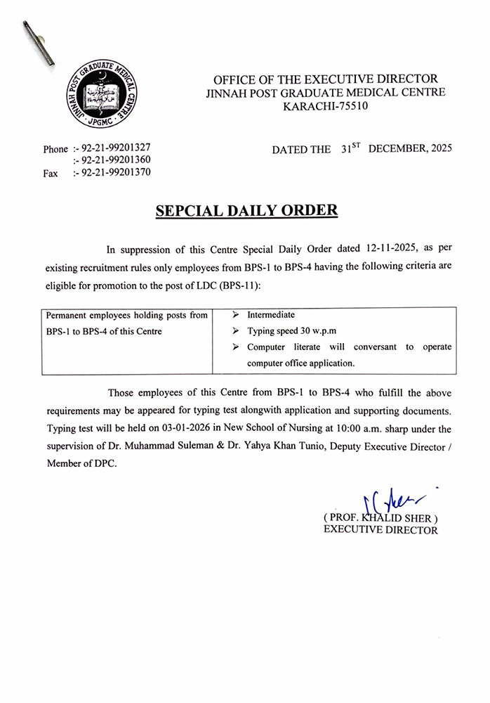 Prior to the DPC meeting, the administration issued Special Daily Orders related to promotion to the post of Lower Division Clerk (LDC-BPS-11). A Special Daily Order dated December 31, 2025, restricted eligibility to permanent employees from BPS-1 to BPS-4, subject to specific criteria including Intermediate qualification, a minimum typing speed of 30 words per minute, and basic computer literacy. A typing test was scheduled for January 3, 2026, at the New School of Nursing, JPMC.