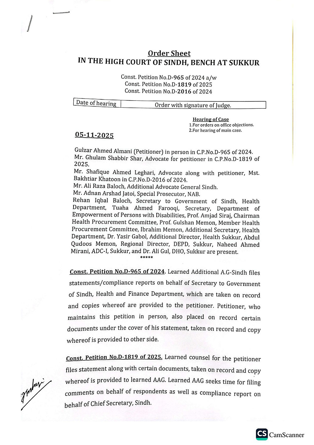 During the hearing of multiple constitutional petitions — D-965/2024, D-1819/2025, and D-2016/2024 — the Court expressed its displeasure over the “disinterest, inefficiency, and ignorance” of government officers, particularly the Additional Secretary and focal persons of the Health Department. The bench noted that despite holding sensitive and responsible assignments, the officers had demonstrated “inability and incapacity” in fulfilling their duties.