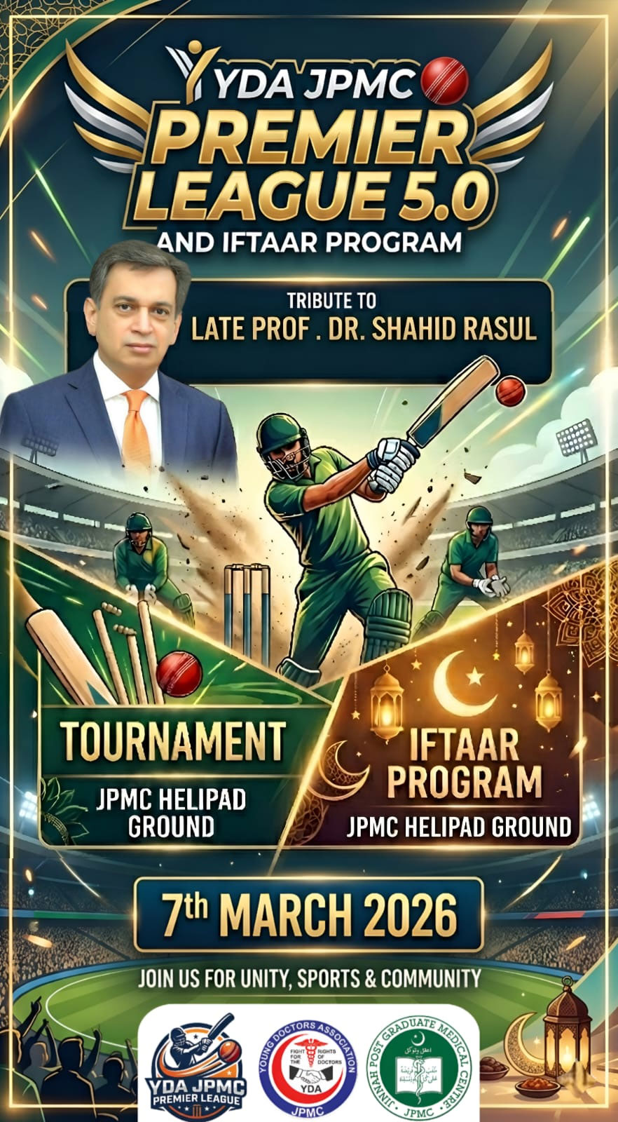 KARACHI: The Young Doctors Association (YDA) Jinnah Postgraduate Medical Centre (JPMC) will organize its 5th Annual Iftar Tournament, Iftar Dinner and Night Cricket Tournament on March 7, 2026, at the Helipad Ground of Jinnah Postgraduate Medical Centre, Karachi.